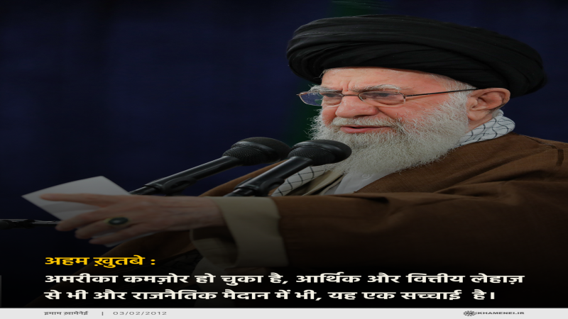 अमरीका कमज़ोर हो चुका है, आर्थिक और वित्तीय लेहाज़ से भी और राजनैतिक मैदान में भी, यह एक सच्चाई है। फ़िलिस्तीन के मसले में उसको नाकामी हाथ लगी है, इराक़ के मसले में वो नाकाम हो गया, अमरीकी चाहते थे कि इराक़ को ख़ुद चलाएं, इराक़ी क़ौम उठ खड़ी हुयी और इसकी इजाज़त नहीं दी, उन्होंने चाहा कि अपनी मर्ज़ी की कठपुतली सरकार ले आएं, इसमें भी वे नाकाम हो गए, चाहा कि कैपिचुलेशन के ज़रिए इराक़ में जमे रहें, इराक़ी क़ौम और सरकार ने इसकी भी इजाज़त नहीं दी। इसी वजह से अमरीकियो का कोई सपना पूरा नहीं हो सका और उन्हें अपना सा मुंह लिए इराक़ से निकलना पड़ा...आंतरिक मसलों में भी अमरीका कमज़ोर हो चुका है, जिसे अमरीकी छिपाने की कोशिश कर रहे हैं और इसका इक़रार करना नहीं चाहते।