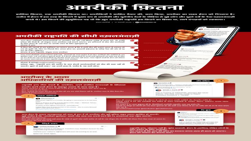 ईरान के हालिया फ़ितने में अमरीकी राष्ट्रपति और आला अमरीकी अधिकारियों की सीधी दख़लअंदाज़ी को उजागर करने वाला एक इन्फ़ोग्राफ़ पेश है।