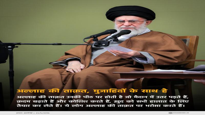 आपने अगर संघर्ष किया और दृढ़ता दिखाई तो अल्लाह की ताक़त आपके साथ होगी। वो लश्कर जिसका अल्लाह मददगार न हो वो कुछ नहीं कर सकता। एक ऐसा लश्कर जिसकी पीठ मज़बूत है, जिसके पास रिज़र्व फ़ोर्स है, अथाह ताक़त का भंडार है, वो सारे काम कर सकता है। एक ऐसा लश्कर जिसकी पीठ मज़बूत है, उसके पीठ पर अल्लाह की ताक़त हो तो क्या ऐसा लश्कर हार सकता है? इसी उसूल के तहत साम्राज्यवाद के क़ब्ज़े में मौजूद सभी सरज़मीनें आज़ाद हो सकती हैं, इसी उसूल के तहत फ़िलिस्तीन भी आज़ाद हो सकता है, इसी उसूल पर अमल से कोई भी राष्ट्र कमज़ोर न रहेगा...अल्लाह की ताक़त उनकी पीठ पर होती है जो मैदान में उतर पड़ते हैं, क़दम बढ़ाते हैं और कोशिश करते हैं, ख़ुद को सभी हालात के लिए तैयार कर लेते हैं। ये लोग अल्लाह की ताक़त पर भरोसा करते हैं। "यह इसलिए है कि अल्लाह अहले ईमान का सरपरस्त है और जो काफ़िर हैं उनका कोई सरपरस्त और कारसाज़ नहीं है" (सूरए मोहम्मद, आयत-11) इमाम ख़ामेनेई 23/5/2016