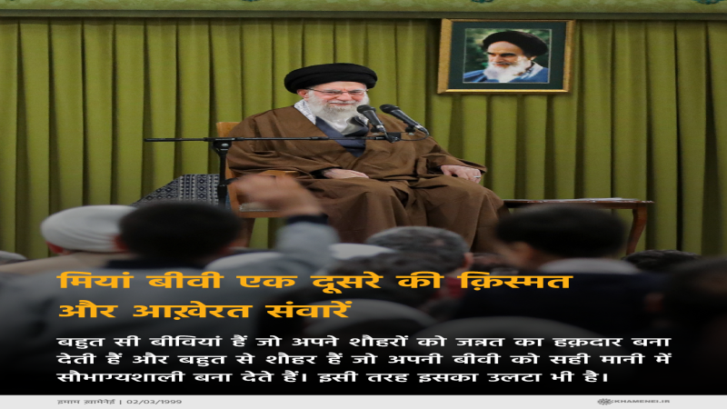 बहुत सी बीवियां हैं जो अपने शौहरों को जन्नत का हक़दार बना देती हैं और बहुत से शौहर हैं जो अपनी बीवी को सही मानी में सौभाग्यशाली बना देते हैं। इसी तरह इसका उलटा भी है। मुमकिन है (शादी से पहले) शौहर अच्छा रहा हो मगर बीवी उसे जहन्नमी बना दे या बीवियां अच्छी रही हों जिन को उनके शौहरों ने जहन्नमी बना दिया हो। अगर शौहर और बीवी दोनों इस बात पर ध्यान दें तो वो अच्छी नसीहतों के ज़रिए और आपस में अच्छे सहयोग से घर में धर्म व नैतिकता की बातें करके और वो भी ज़बानी बातों के ज़रिए नहीं बल्कि अपने व्यवहार व अमल के ज़रिए इस तरह एक दूसरे की मदद करते हैं। ऐसी स्थिति में ज़िन्दगी सही मानी में मुकम्मल और ख़ूबसूरत हो जाएगी। इमाम ख़ामेनेई 02/03/1999